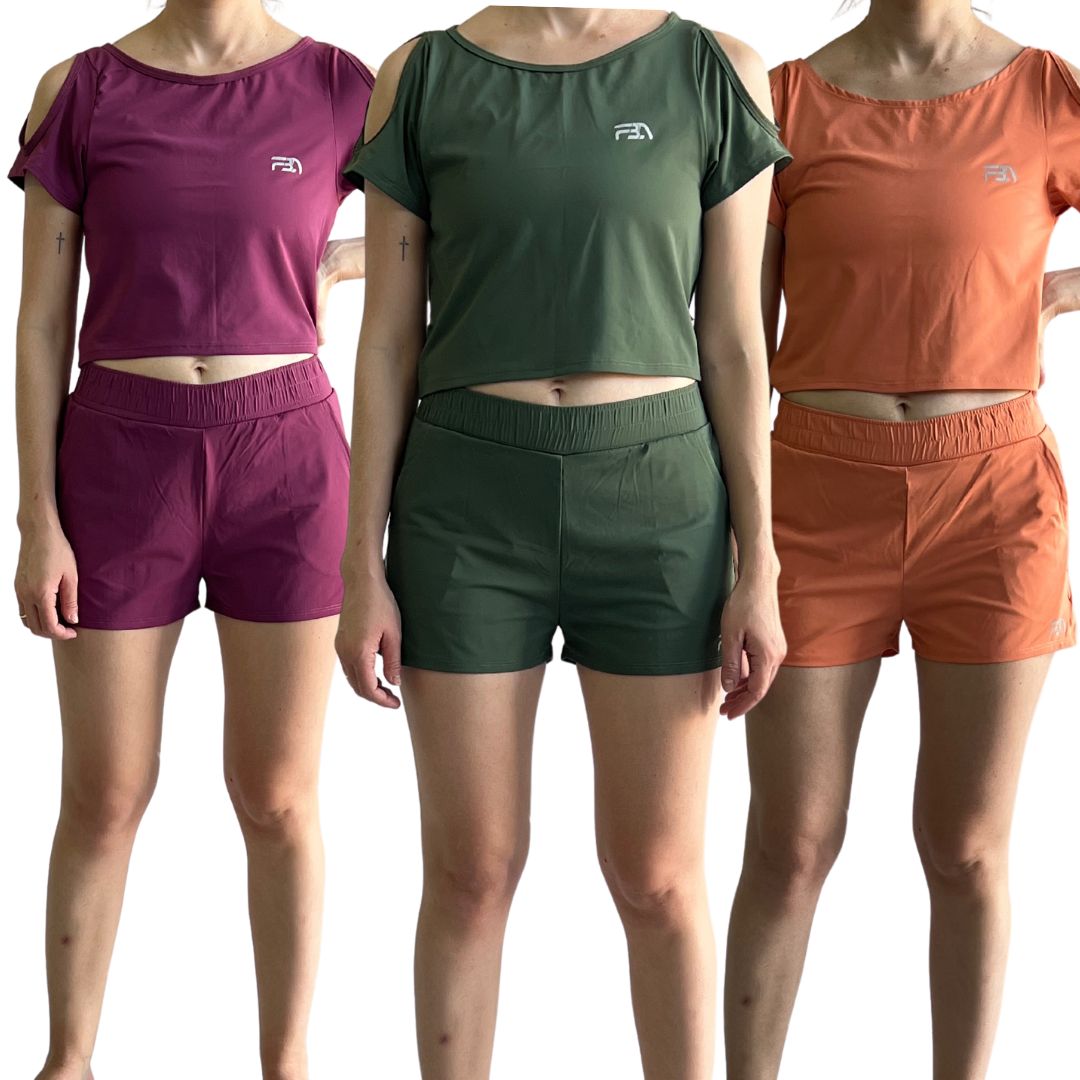 Conjunto de short duplo com cropped de manga curta, composto de 88,6% poliamida e 11,4% elastano, proporciona conforto, mobilidade e elagância seja qual for sua atividade física favorita!